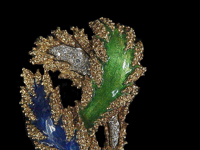 This spectacular 18kt yellow gold diamond pin has been designed with blue and green enamel. Alternating in design with the blue and green enamel are (20) round brilliant full cut diamonds having excellent color, clarity and quality with a total diamond weight of approx. 75/100 carats. This leaf pin has a smooth~textured finish enhancing the beauty and originality of the pin. This pin can be worn for casual or formal wear, and looks extraordinary on a blouse or jacket. This pin displays magnificent workmanship by a true artisan and connoisseur of enamel craftsmanship. ……….BREATHTAKING TREASURE......