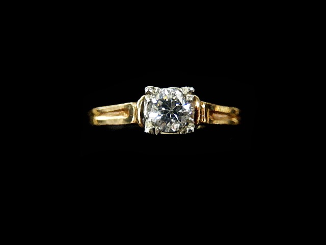 This sweet 14kt yellow gold diamond ring has been designed with a white gold square box set with a .25/100 carat round European cut diamond. The diamond has beautiful quality, with nice white color and excellent clarity. The ring which is circa 1930’s, has a simplistic yet elegant style and looks great worn alone, stacked with other rings, or as an engagement ring.....DAINTY TREASURE......