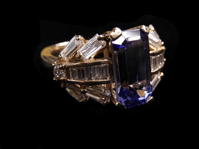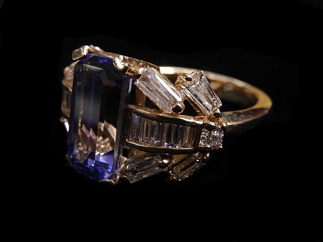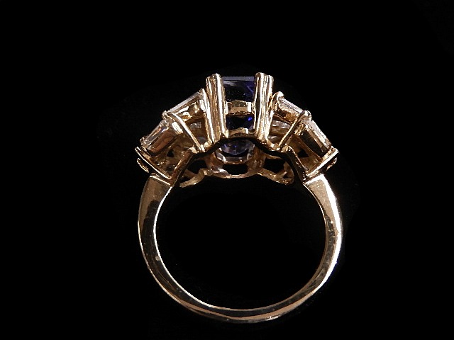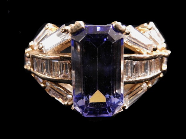 This magnificent 18kt yellow gold diamond-tanzanite ring centers upon (1) genuine rectangular shaped tanzanite. The tanzanite has gorgeous ocean blue color and is surrounded by (18) baguette diamonds and (2)round brilliant full cut diamonds. The diamonds are exceptional quality all matching in color and clarity with a total diamond weight of approx. 2 1/2cts. The tanzanite weighs approx. 6cts…… SENSATIONAL DESIGN!!!!!